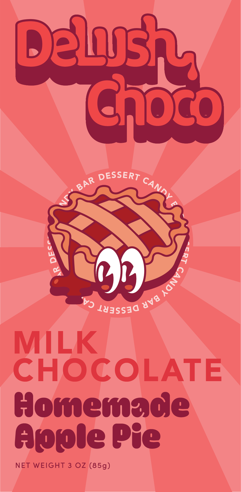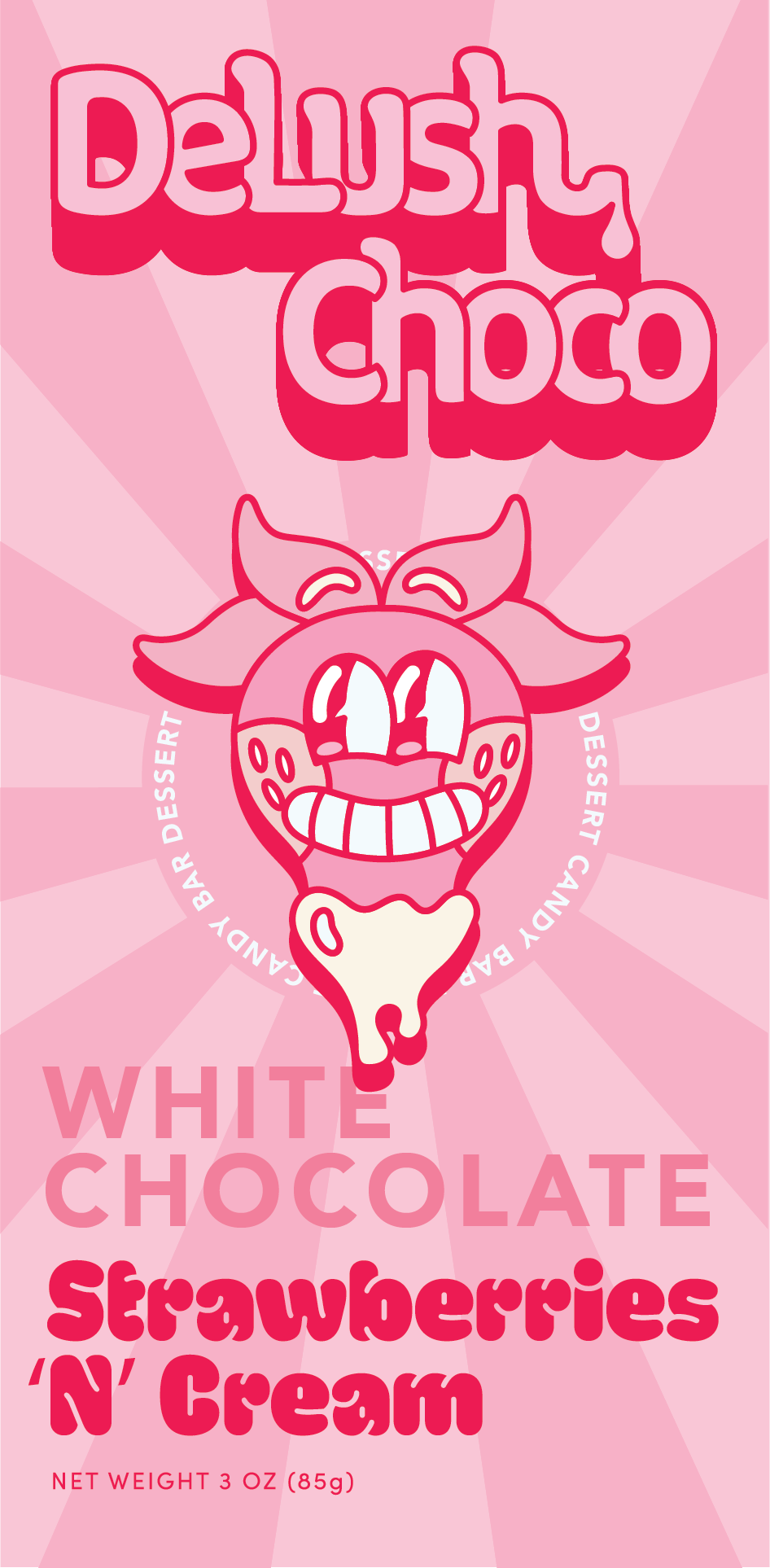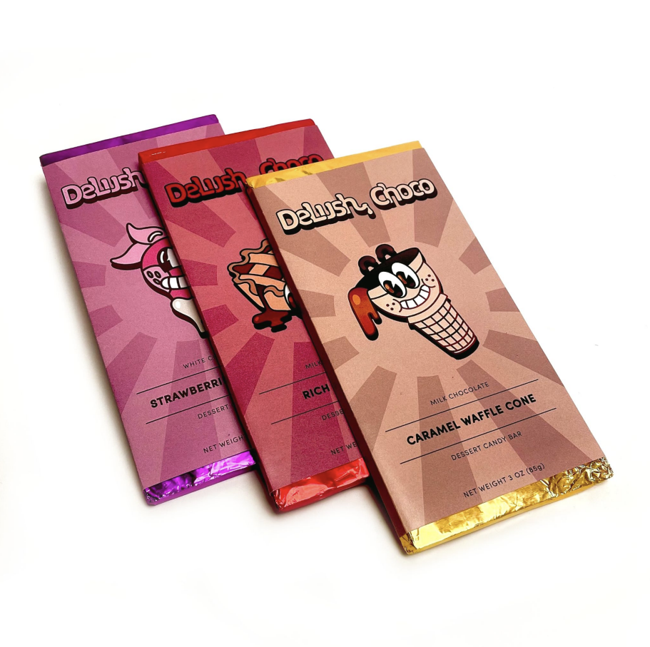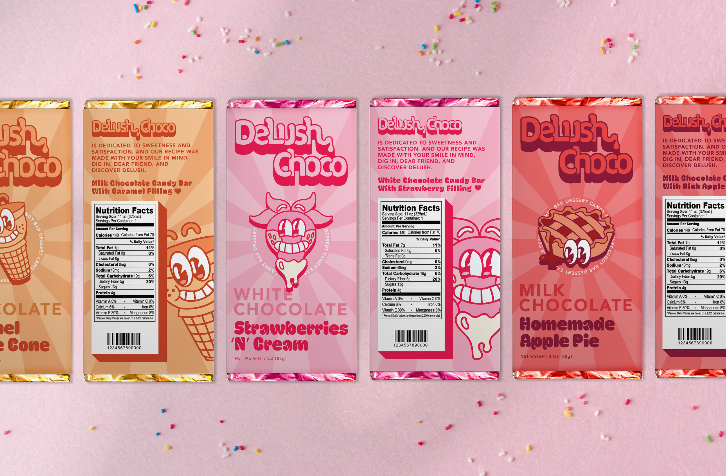 The hypothetical company Delush Choco has successfully launched a line of three jumbo dessert chocolate bars characterized by an exciting, playful, and retro aesthetic. The visual elements evoke sensory qualities that shape the perception of what each dessert flavor might taste like. Ultimately, DeLush Choco promotes high-quality chocolate with an irresistibly sweet appeal.